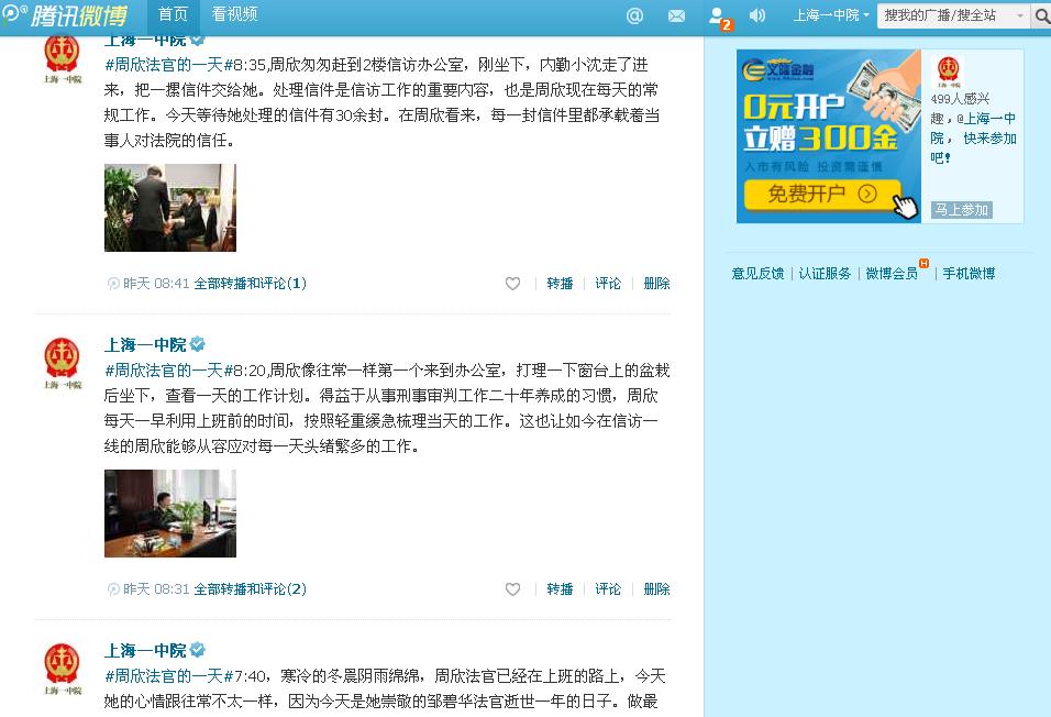 昨天(12月10日),我院以“周欣法官的一天”为主题,在一中院腾讯和新浪2个官方微博通过直播的形式,追踪并记录下立案庭信访办信访组组长周欣法官平常而忙碌的日常工作。直播时间从上午8点05分持续至下午6点10分。期间,共发布微博30条、计5200多字,配发现场图片13张。本次微直播活动与上海高院“浦江天平”官方微博同步转播,当日我院官方微博浏览量合计26778人(次)。(图、文:上海一中院)